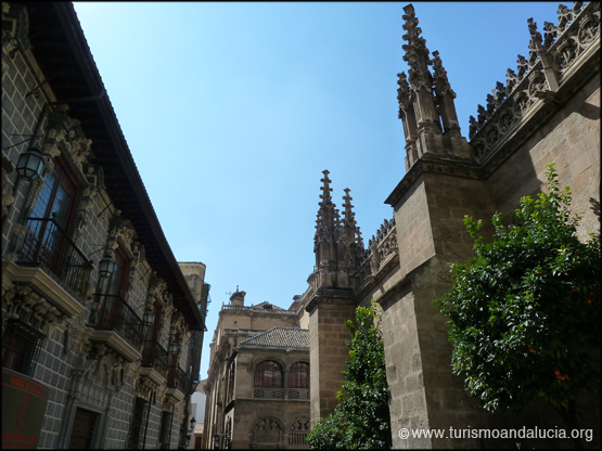 La Gran Vía, que deja a su derecha el Albaicín, introduce al visitante en un entramado de calles estrechas donde se dan cita imponentes templos levantados por los cristianos como símbolo de la nueva fe, destacando por su relevancia la colosal Catedral, que colinda con el Palacio Episcopal y con la Capilla Real, panteón de los Reyes Católicos.