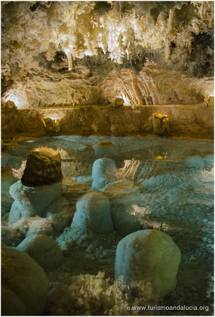 gruta de las maravillas aracenaNo dejaremos de maravillarnos con las fantásticas formaciones excéntricas, en formas de estrellas, explosiones, por los extrañísimos pisolitos, bolas calcáreas que encontramos en el fondo de los charcos de las cuevas, o las estalactitas, las que cuelgan, o estalagmitas que formadas por el incesante goteo, que desprende la calcita, forma fantásticas formas que en algunos casos se unen formando magníficas columnas que parecen labradas a conciencia por algún titánico cantero.